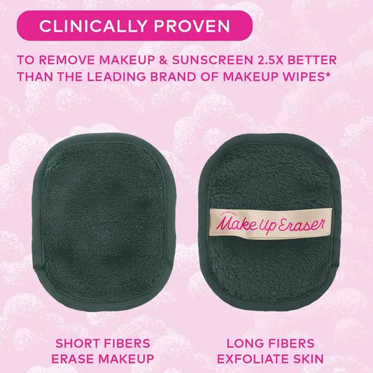 Erase all makeup with JUST WATER™ including waterproof. Our patented, water-activated, cloud-soft fibers gently & easily remove all makeup & sunscreen from pores. 2 in 1 benefit: one side erases makeup & one side exfoliates skin.