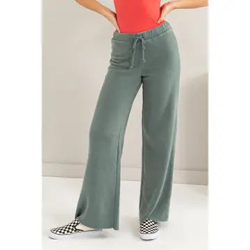 FINISH YOUR SPRING LOOK THE RIGHT WAY. THESE PANTS HAVE AN EFFORTLESSLY STYLISH LOOK TO THEM, TOPPED WITH AN ELASTICATED WAISTBAND WITH DRAWSTRING CLOSURE FOR AN EASY FIT. FLATTERING SILHOUETTE DESCENDS DOWN INTO FLARED LEGS WITH RAW EDGE CUFFS.