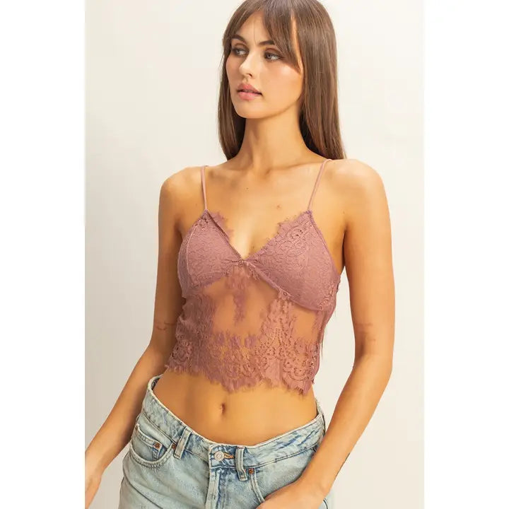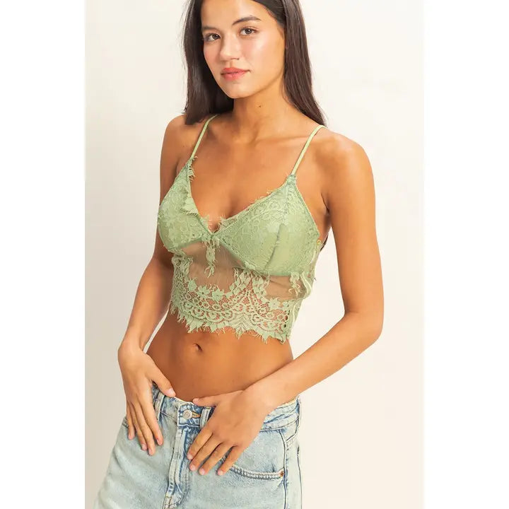 IT FEATURES THE CROPPED BODICE, DECORATED WITH EXQUISITE, LACE-INSPIRED EMBROIDERY ON MESH FROM BUST DOWN. IT HAS A DEEP V-NECKLINE WITH SPAGHETTI STRAPS AND FRAY FINISH ON HEM AND NECKLINE.