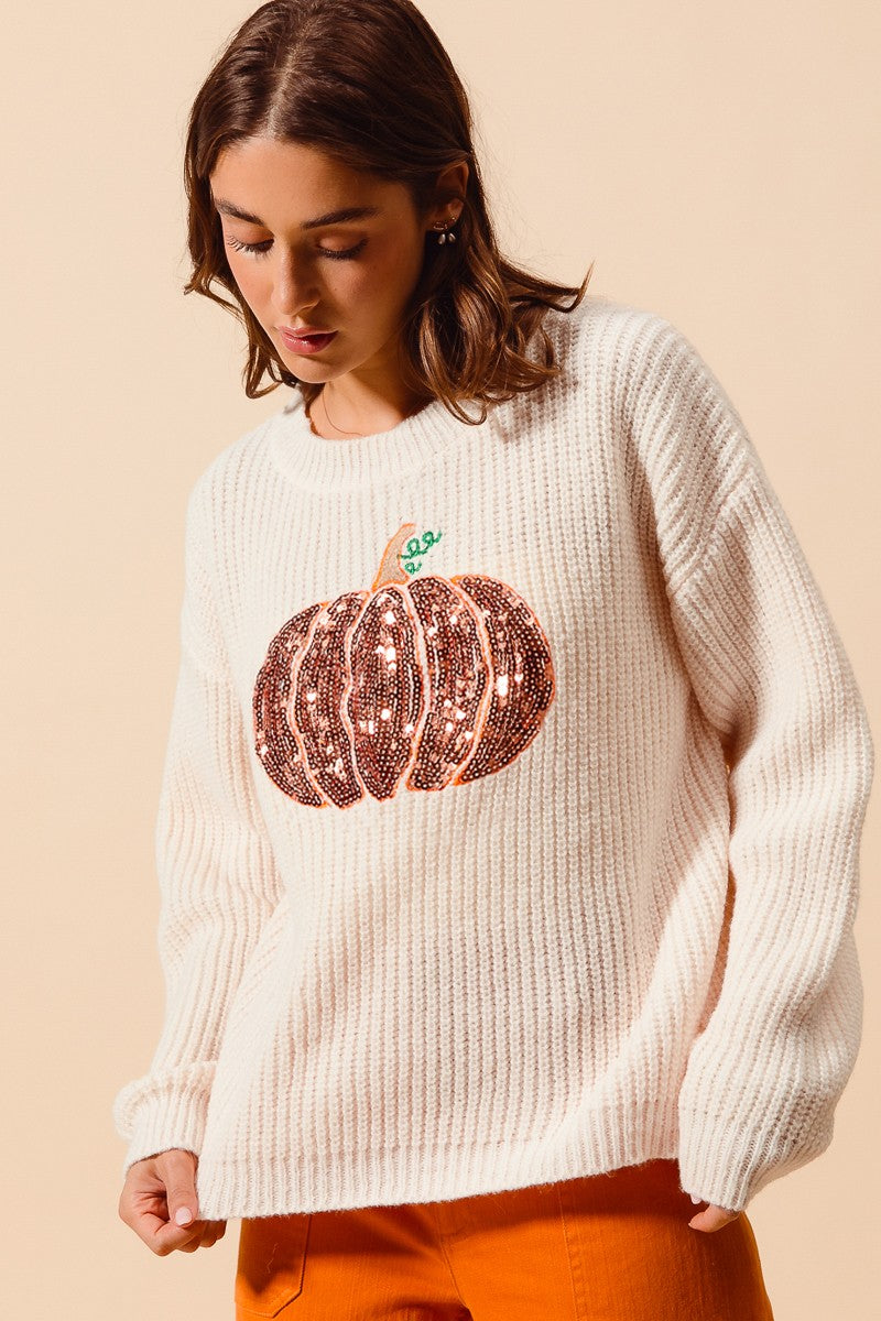 ADD A TOUCH OF SPARKLE TO YOUR FALL STYLE WITH THIS TOP! THE SOFT NEUTRAL BASE MAKES IT EASY TO PAIR, WHILE THE SHIMMERING SEQUIN PUMPKIN DESIGN BRINGS FESTIVE CHARM WITH A PLAYFUL TWIST. PERFECT FOR PUMPKIN PATCH TRIPS, FALL GATHERINGS, OR JUST SHOWING OFF YOUR FALL SPIRIT IN STYLE.