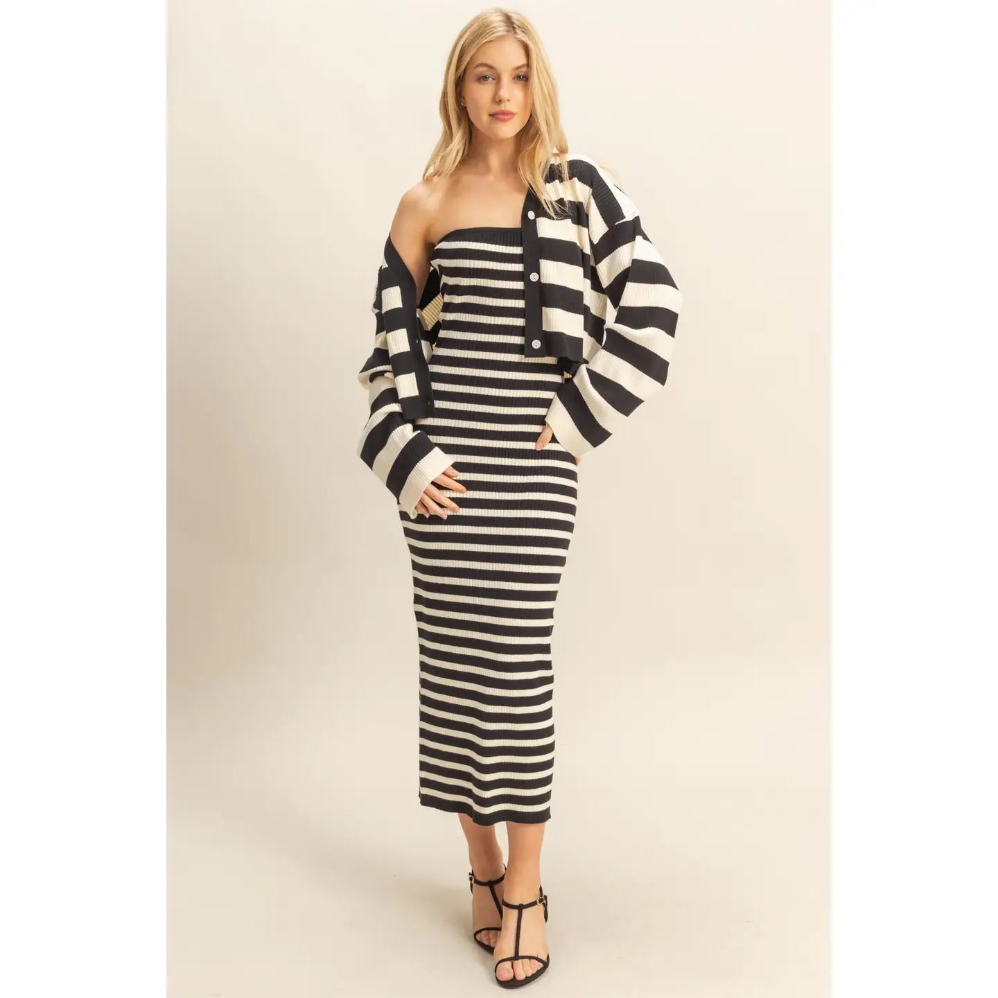 Introducing our set, a chic, coordinated knit set that features a striped cardigan and matching midi dress, showcasing a harmonious blend of comfort and style. The top presents a classic V-neckline complemented by front button closures, offering a relaxed yet refined look.